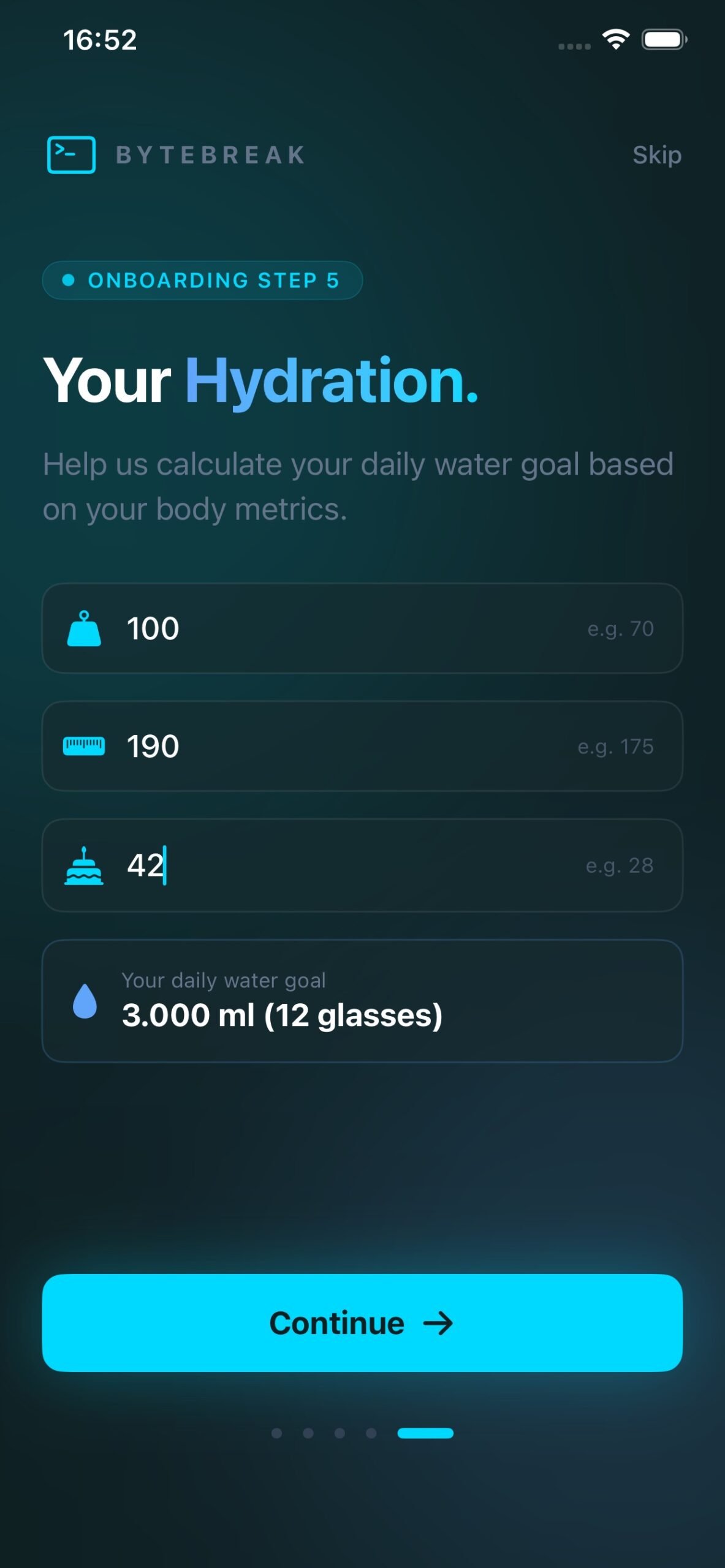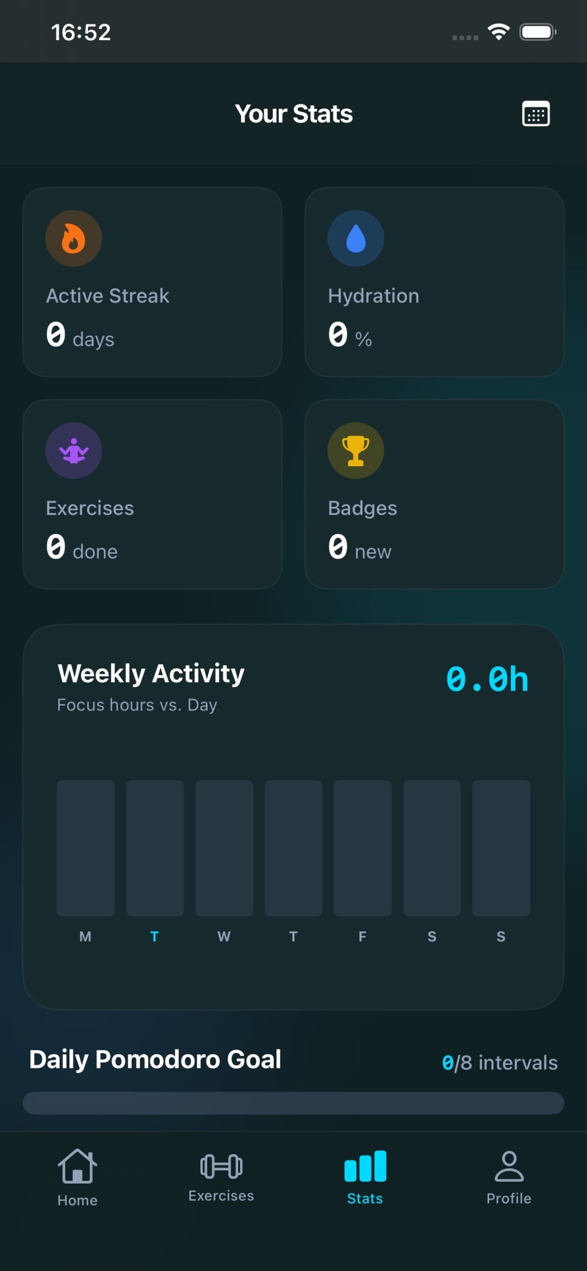 Yazılımcılar için tasarlanmış wellness uygulaması. Pomodoro odak zamanlayıcısı, su takibi, boyun/omuz/göz egzersizleri, seviye/XP sistemi ve başarı rozetleri ile sağlıklı çalışma alışkanlıkları geliştirin.